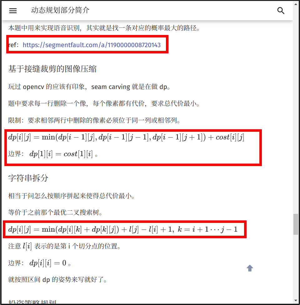 一般情况下,我们建议将引用的资料列在文末的 ##参考资料与注释 一节,并在原句后面加上脚注,而不是直接给出链接.同时一定要避免使用 LaTeX 公式表达代码,上图中两个中括号就是不规范的写法.我们建议使用 dp(i,j) 或者 dp_{i,j}.